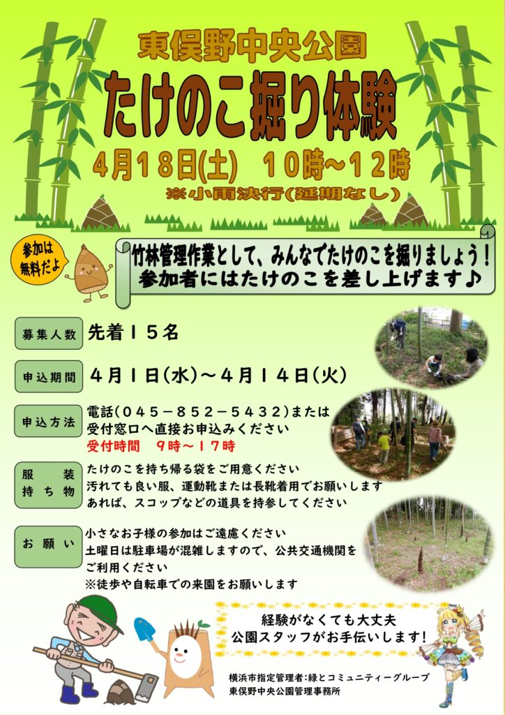 当公園内にあるモウソウチクの竹林では、4月に入るとたけのこが出ます。たけのこは、あっと言う間に立派な竹に成長しますが、放置しておくと竹の密度が上がり、竹林の範囲がどんどん拡大してしまいます。