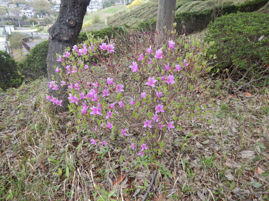 当公園内には多くのツツジが植えられています。ひっそりと花をつけているミツバツツジは、梅林の一角に植えられています。