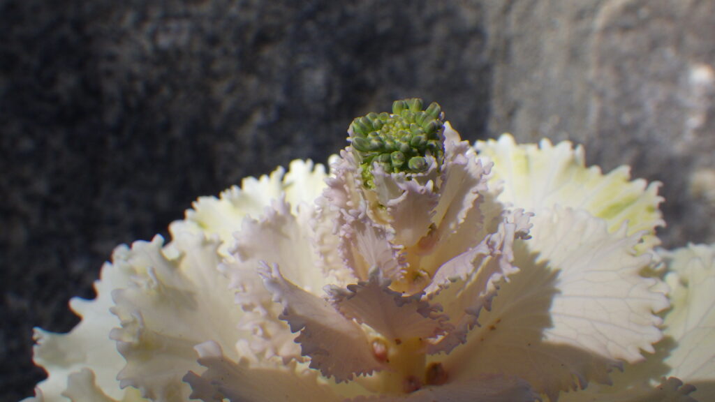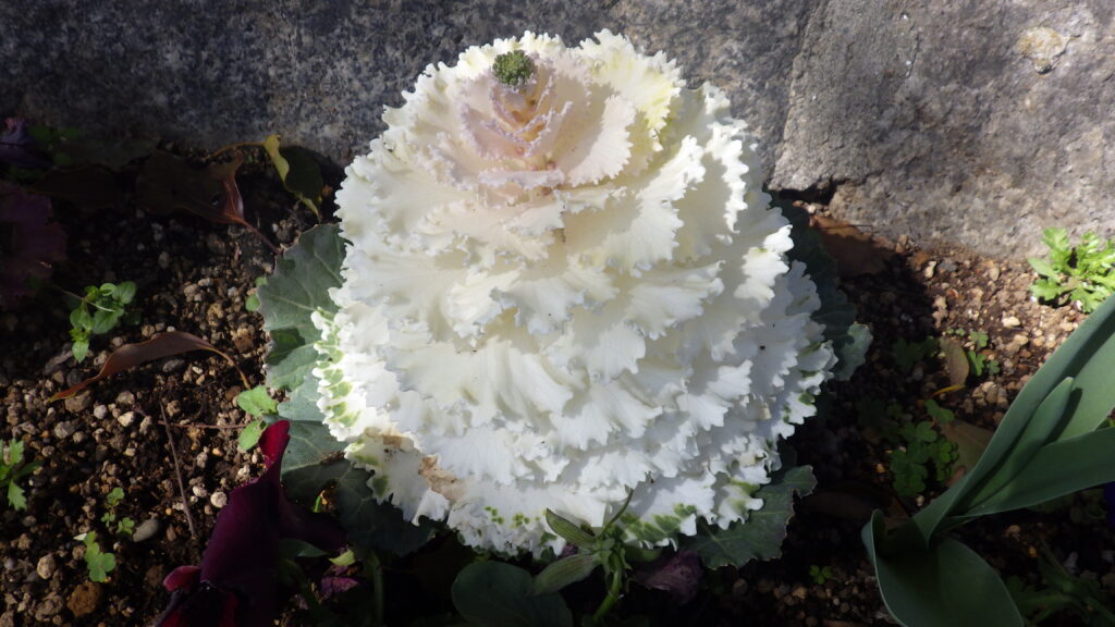 昨年の11月の植えた、花壇の葉牡丹。約4か月経つとけっこう大きく育ちますね。植えた時は小さいポットサイズだったんですよ。で、ですね。葉牡丹も花が咲くんですよ。そのつぼみの写真です。あとひと月もすればとうが立って、菜の花みたいな黄色い花が咲きます。それを見ると、葉牡丹もアブラナ科の植物なんだなぁと実感します。