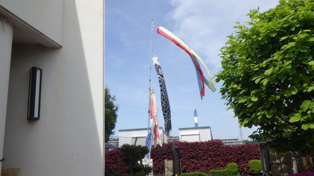 こいのぼり、を来園者の方と緑道利用者の方が楽しめるように、公園入口箇所に取り付けました