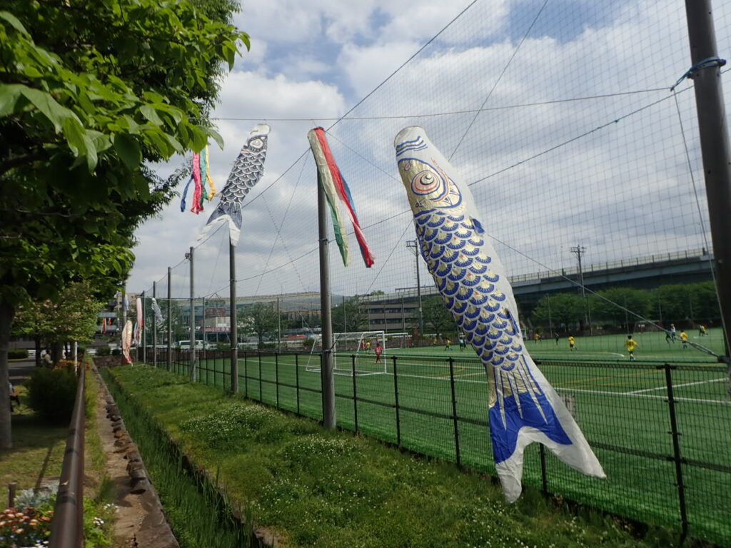 毎年恒例ではありますが、こどもの日が近づいてきたので園内の球技場横のスペースに鯉のぼりを飾り付けました。